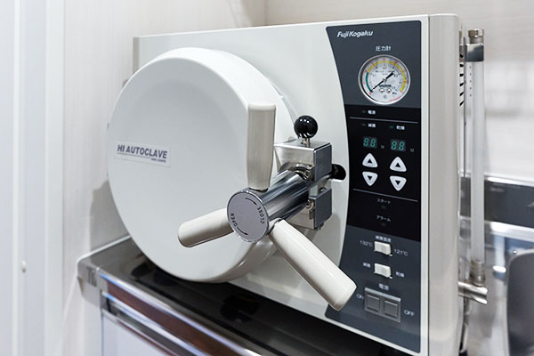 治療器具を高圧・高温の蒸気で滅菌し、全ての細菌やウイルスを不活化させます。患者さまごとに滅菌パックされた清潔な器具を使用し、徹底した院内感染予防に努めます。