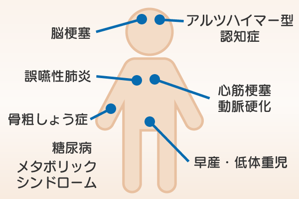 また、糖尿病とは相互に悪化させ合う関係にあるほか、アルツハイマー型認知症や骨粗しょう症との関連も指摘されています。さらに妊婦さんの場合は、早産や低体重児出産のリスクを高めるなど、全身の健康を脅かす重大な要因となります。