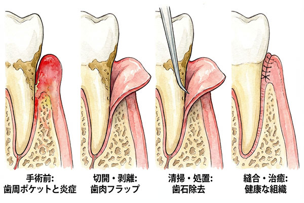 局所麻酔下で歯ぐきを切開してめくり、肉眼や拡大鏡で歯の根元を直接確認できる状態で処置を行います。奥深くに付着した頑固な歯石や感染組織を徹底的に取り除き、歯周ポケットを浅くすることで、歯周病の進行を食い止め、歯を保存できる環境を整えます。