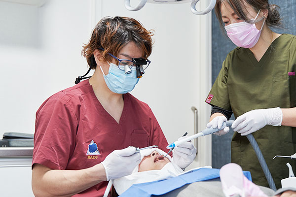 まずはお口の現在の状態を正確に把握するため、口腔内写真やレントゲン撮影などを行い、口腔環境を詳細に調べます。次に、歯垢(プラーク)だけに色が付く専用の薬液(歯垢染色液)を用いた染め出しを行ってみがき残しをチェックし、患者さまに合わせた正しいセルフケア(ブラッシング)の改善指導を行います。
