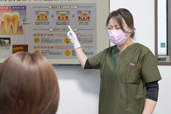当院では、メンテナンスでお越しいただく患者さまを毎回同じ歯科衛生士が対応する「担当制」を採用しています。一人の患者さまを継続的にサポートすることで、より信頼関係が生まれやすくなり、患者さまのライフサイクルや体調に合わせた生活習慣指導や食習慣指導など、きめ細やかなサポートを提供することが可能です。